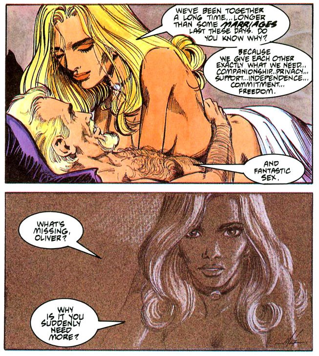 The Longbow Hunters found Green Arrow, who devoted viewers of the CW know is really named Oliver Queen, relocated to Seattle, trying to forge a place for himself as his passes into his forties (this “old man” version of the character is younger than I am right now, which hurts a little). He’s there with his longtime love, Dinah Lance, better known as the fishnet-sporting crimefighter Black Canary. Grell wastes not time in established this story is not going to feature the superheros facing down a bevy of similarly-clad, fairly harmless, goofball villains (in the nineteen-sixties, Green Arrow was likely to do battle with, say, the Clock King). It is going to be about vicious murder, heavy-duty drugs, and grown-up misery. And, of course, there’s going to be sex.