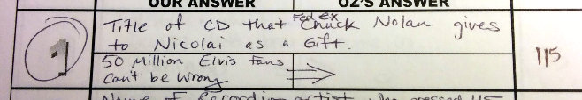Much as I’ve emphasized the value and importance of writing down information this week, there truly is nothing quite like the anxious thrill of snapping of a high-point answer from the ol’ memory bank. I’m intensely reluctant to take notes on movies I’m seeing in the theater. Besides, I’m terrible at it, coming home with scraps of random, practically indiscernible words that I can’t contextualize at all. So when I saw the 2000 Robert Zemeckis film Cast Away, I didn’t write a single thing down. Most of it was Tom Hanks’s character, Chuck Noland, alone on an island anyway. What could be asked? Well, there was the matter of the gift Chuck gives to his girlfriend before getting on that ill-fated plane. In my mind, I could see an image of all those Elvi in gold lamé suits, so I suggested the album with the corresponding cover. The answer was correct, to the lovely tune of triple-digit points. When I tell people I’m heading off to participating in a trivia contest, they assume that’s what it’s like all the time, a pub quiz writ large (and my time as least does do the “pub” part of that experience on a heightened scale). While that’s not really the case overall, on rare occasions it still is. When that answer dredged up from memory nets us major points, it’s a ridiculously thrilling moment.