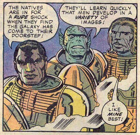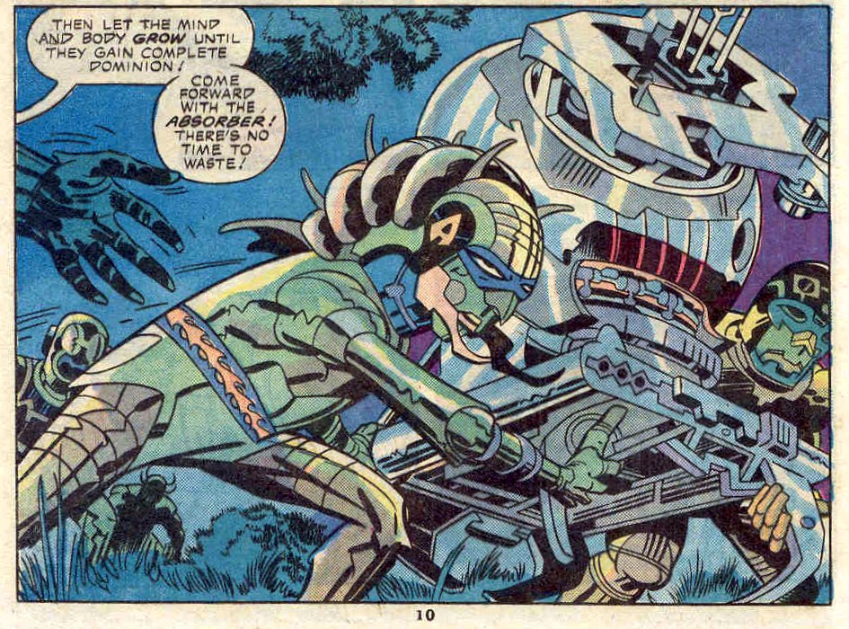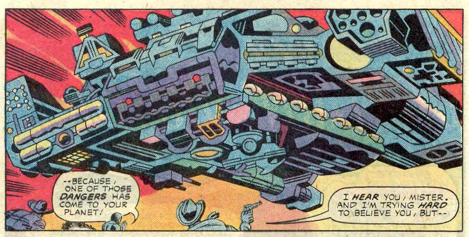 In the early issues of the series, the Galactic Rangers have come to Earth, looking to protect this primitive planet from malevolent forces beyond the population’s understanding. This gives Kirby plenty of chances to heighten the sense of wonder through the apoplectic and terrified reactions of the Earthling law enforcement officials Captain Victory and his crew encounter. Mostly, though, there’s no real need for such devices. The outrageous boldness of Kirby’s concepts is enough to leave any reader’s head spinning. His storytelling was typified by a sense of constant wonder and off-the-cuff inventiveness, making his comics progress with the exuberantly free logic that a child brings to the crafting a fiction, with any idea that pops into their head instinctively deemed good enough to keep the tale going. Of course, as we’re talking comics here, the lunatic ideas are only as good as their rendering in pen and ink. Kirby’s got that sorted out.