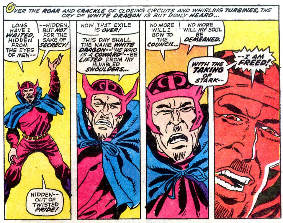 Just look at that array of hastily sketched in faces and globby Iron Man armor, the holes in the faceplate reduced to jabbed on lines. Then there’s the villain of the issue, the unfortunate White Dragon.