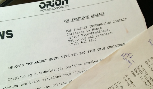These particular script pages were typed up on the back of some Orion Pictures press releases, hence the image above that shares the marketing department’s spectacularly groan-worthy headline announcing the release of the Mermaids, home of a very strong Winona Ryder starring performance. It’s so very tempting to aggressively annotate the news items, but I’ll leave the old words to stand for themselves, except for one freshly added hyperlink that I simply couldn’t resist. I also note that my cohort’s rumor-slinging about films in trouble was spot-on accurate. Every one of those four films was a dud, in one way or another. Valkenvania was renamed Nothing But Trouble, one of the most damningly accurate titles in film history.