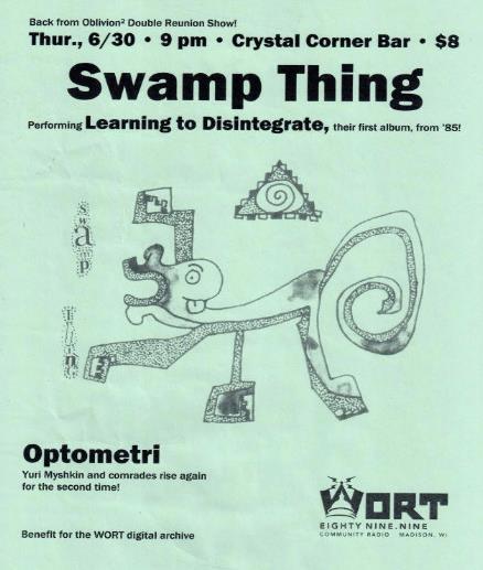 (Disclaimer: At this point, it’s especially important to me that I share that Swamp Thing’s Learning to Disintegrate is available for digital download on a website that is dedicated to making sure artists get proceeds from the sales. It cannot be purchased track by track. Since it is only available as a full album, please view the shared track as an enticement to turn over ten dollars to the best rock band Madison, Wisconsin ever produced. As was the case with the show I attended, proceeds on the sale of the album go toward our local community radio station, the rare current-day media entity that actually cares about its mandate to serve the public. Especially under these circumstances, I will gladly and promptly remove this track from my little corner of the digital world if asked to do so by any individual or entity with due authority to make such a request.)