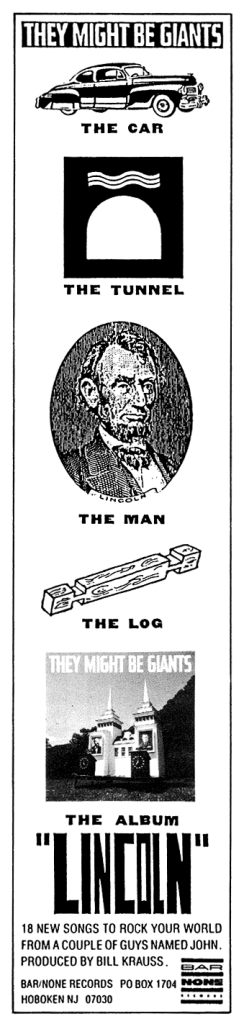 I can assure you that college radio programmers required no heavy-handed promotional coercion when They Might Be Giants release their sophomore album, Lincoln, in the fall of 1988. Even so, it was a fine reassurance that trade publication advertisements for the release from the oddball, wildly creative duo eschewed the usually bland band photo or rote rendering of the album cover. In keeping with the cleverness of the band, Lincoln was touted with a succession of images offering a reminder of other things that had carried the same name over the years, such as the tunnel and the log, and the promise of “18 new songs to rock your world from a couple of guys named John.” It’s an incredibly simple ad. It’s also one of the only ones from my college radio days that I still remember, over thirty years later.
