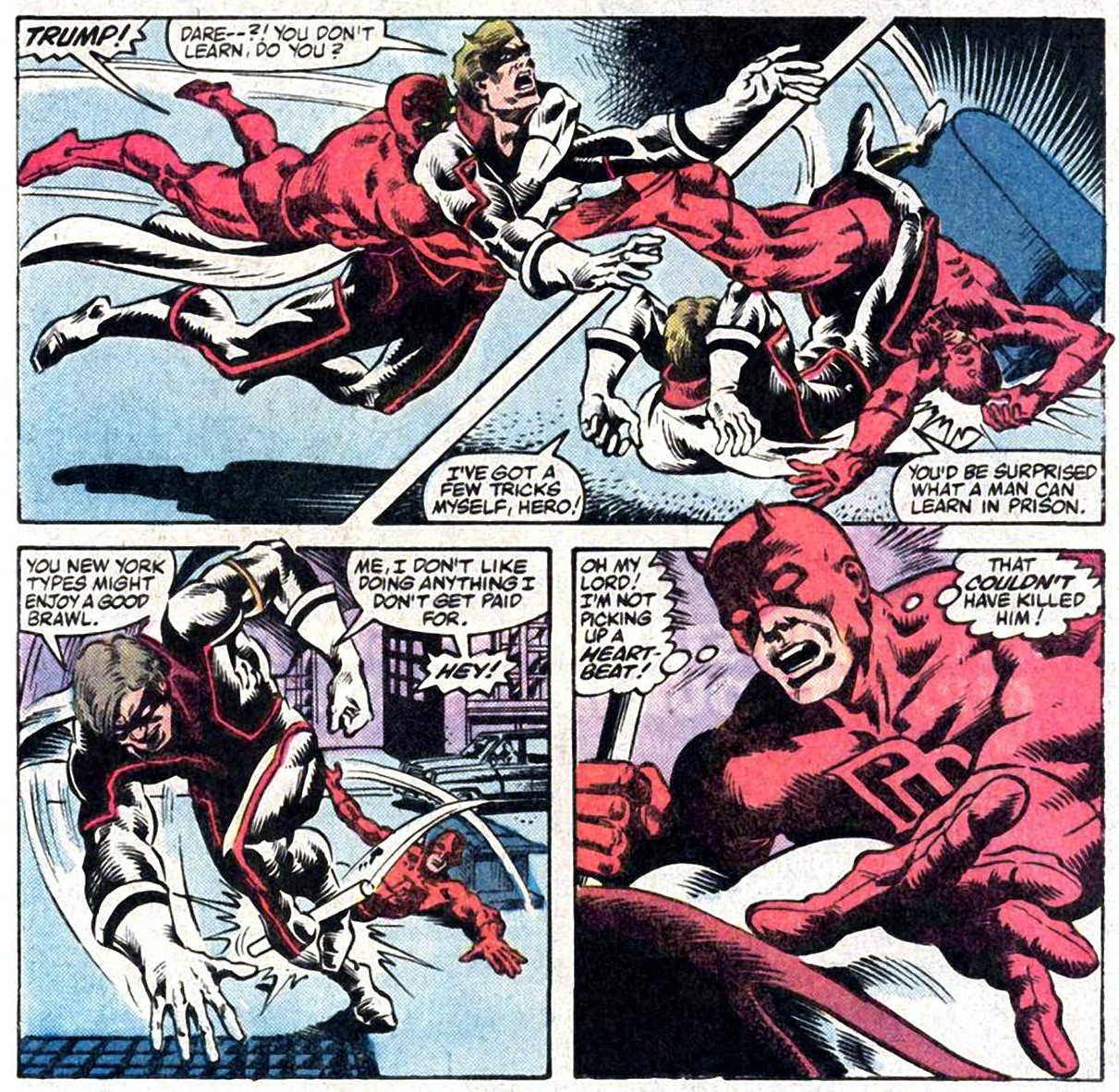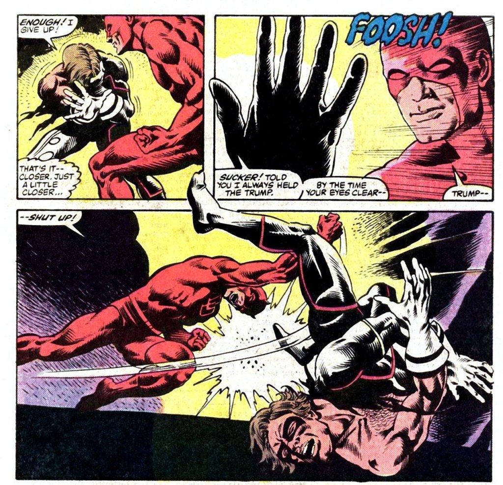 Marvel’s man without fear, the costumed do-gooder known as Daredevil, went through his first couple decades of publication amassing one of the more laughable rogues‘ galleries in all of comics. Frank Miller rectified the situation somewhat during his storied run on the title as writer and artist, partially by giving Daredevil an arch enemy borrowed from another title. But ol’ hornhead apparently couldn’t escape disastrous fools with malevolent intent forever. Not long after Miller first stepped away from the character, Daredevil found himself trading punches with a fiend called Trump.