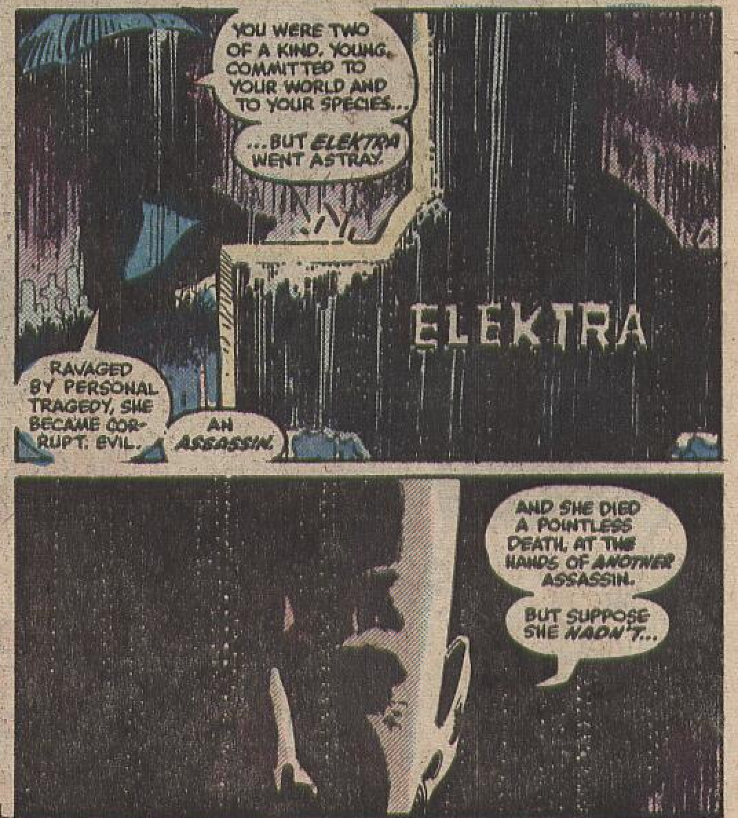 The grim conclusion, then, is not that Elektra’s survival precipitates a worse trajectory for her and her beloved. Instead, it is that the alternate timeline is not shared with only the dear reader. Back to Miller’s initial shift of common story structure, the turn of events is yet bleaker. The Matt Murdock of the Marvel Universe proper — the real Matt Murdock — knows that he could be living a better life than the one he is in. In its general state, What If? is a silly diversion. For Miller, then at the peak of his comic-book craftsmanship, What If? was another means to ply his speciality of delivering emotional roundhouses to the characters he knew best.