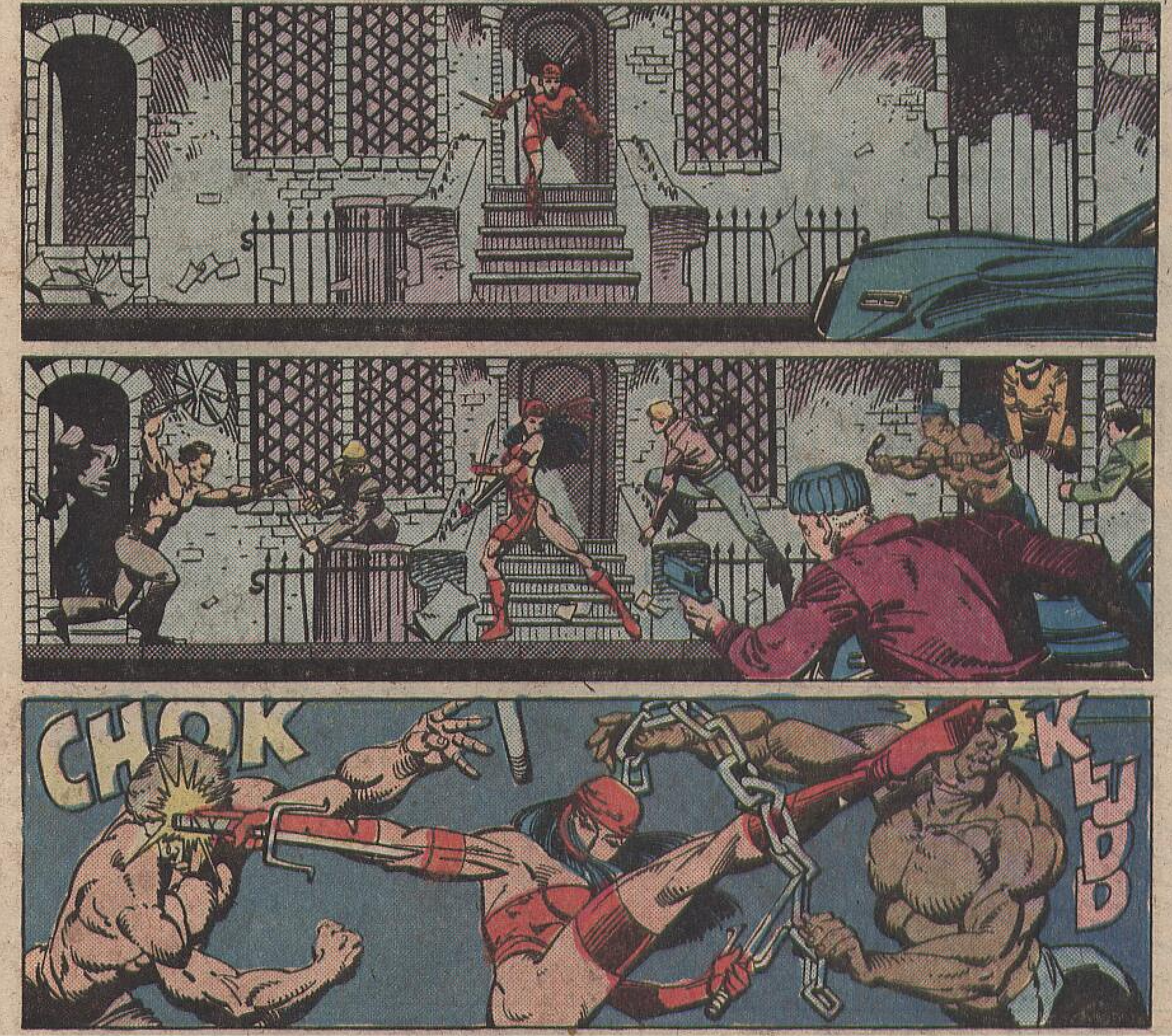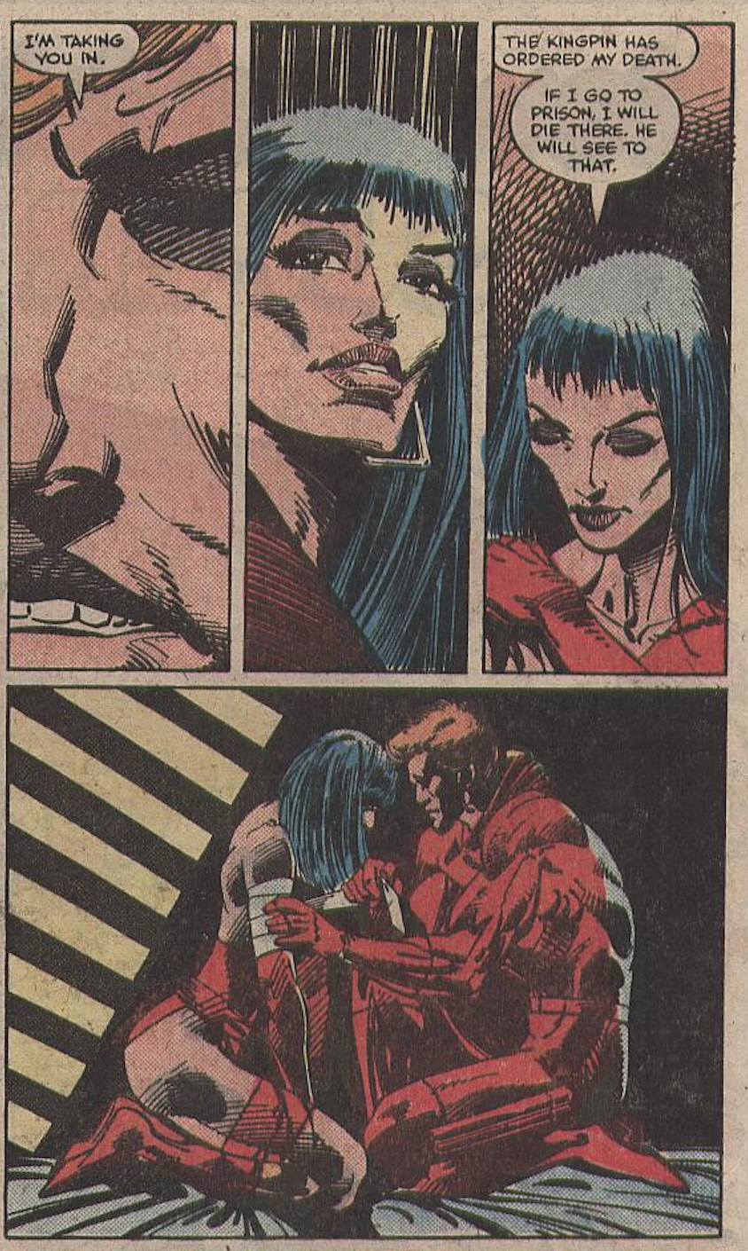 Tonally, the story is markedly different from what usually showed up in What If?, in much the same way that Miller’s moody take on Daredevil put it at odds with the other Marvel titles with which it shared the spinner rack. Rather than racing through events familiar to most Marvel fans on the way to freewheeling narrative transformation, Miller really homes in the story as it might have taken place with one key change that spared Elektra the particular battle that ended her life. The story progresses deliberately, Miller properly thinking through how characters and situations would have gone differently with the shift in fortunes. That includes Elektra being otherwise tested by a onslaught of assailants when the city’s main crime lord, the hulking figure known as the Kingpin, puts a price on her head.