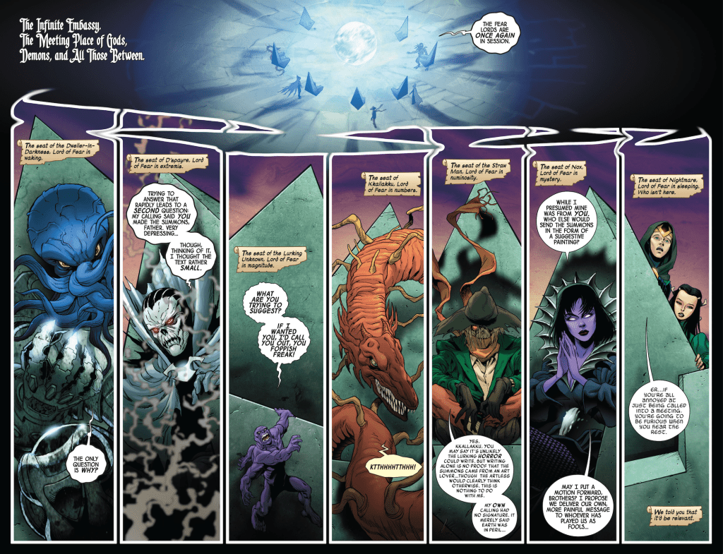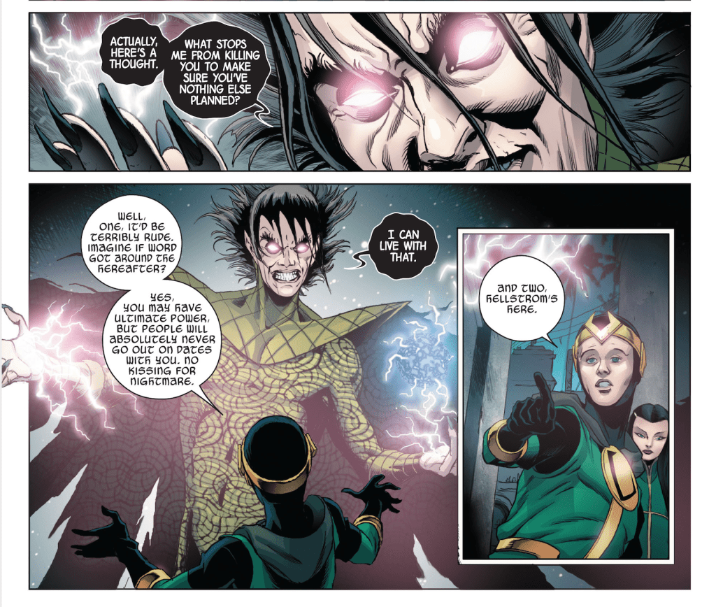 Gillen worked with a few different artists on this run — including Richard Elson, who handled art duties on the storyline titled “The Terrorism Myth” — and he wisely leaned into his collaborator’s strengths. The whole of Marvel’s more mystic mythos was Gillen’s play set, and he laid out opportunities to memorably warp reality. The page layouts were often thrilling in their dynamism and scope, especially when Gillen was taking clear delight in just how many grand ghoulies he could draw into his saga.