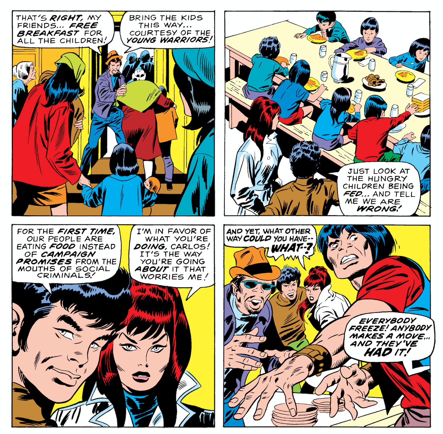 By this point in time, Black Widow didn’t have that much history to contend with, mostly a run as a supporting character in Avengers. That relatively empty slate gave writer Gary Friedrich the latitude to do whatever came to mind, and there are times when it seems he’s trying out a little bit of everything. Dialogue implies Natasha is living a socialite life, and there’s acknowledgement of her backstory in espionage. Interestingly, though, Friedrich quickly settles on Black Widow as a hero tackling street-level problems in the grittier corners of Marvel’s New York City. She contends with crime bosses and urban decay. Part of the opening storyline involves her interactions with the Young Warriors, a group of activists clearly inspired by the Black Panther Party and the and the Young Lords, right down to the free breakfast program.