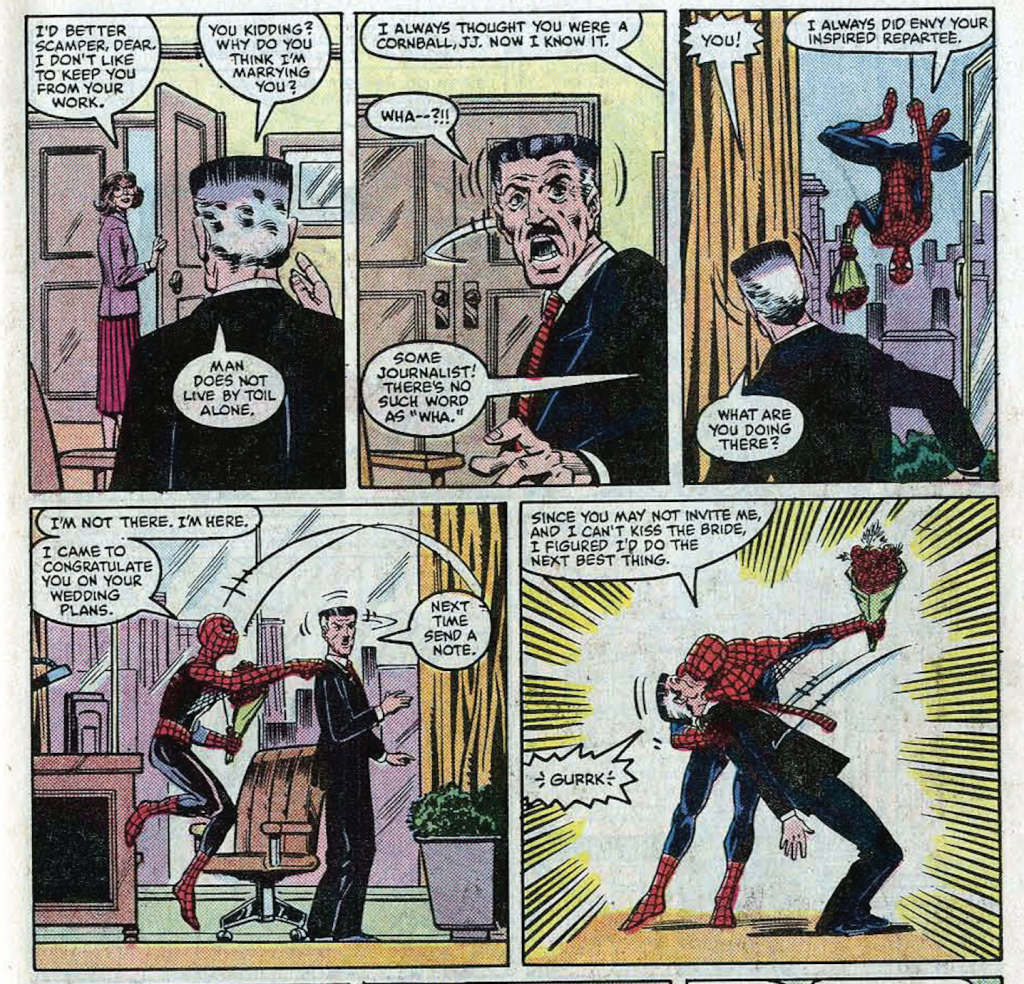 Lee had a lot of support on the issue. The plot was provided by Tom DeFalco, then handling writing duties on the main Spider-Man title. Ron Frenz also carried over from his monthly duties as the well-crawler’s penciler, though trying to squeeze in another thirty-nine pages around his main gig meant he officially provided breakdowns that were ably finished by Bob Layton and Jackson Guice. As special as it was that Lee was on board to provide the dialogue, this was the Marvel of the nineteen-eighties, when continuity was the prime driver. The annual wasn’t really meant to feel like a standalone event. This was part of the big, ongoing story, with the regular storytellers on board to prove it. Shrewdly, this particular part of the big ongoing story gave Lee the opportunity to offer up snappy banter in one of the great antagonistic relationship in all of comics, that between Spider-Man and flat-topped newspaperman J. Jonah Jameson.