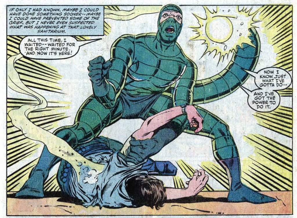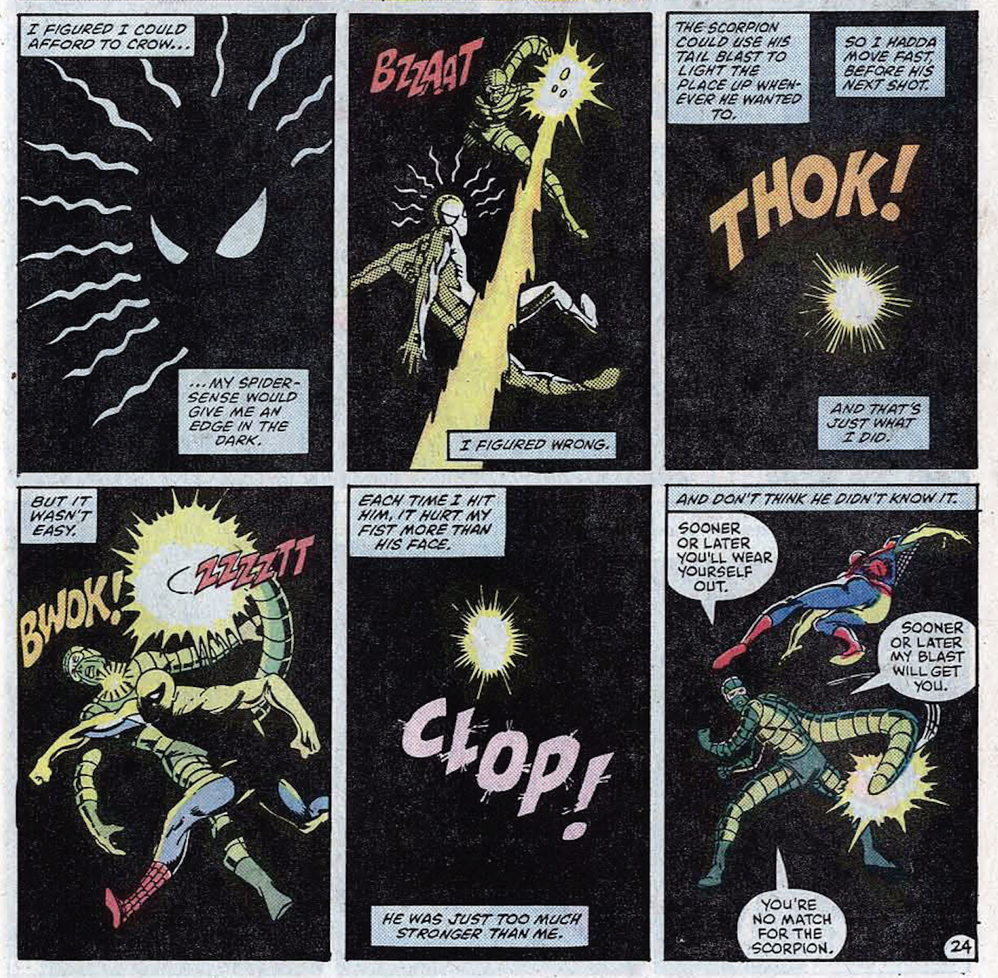 The story features first-person narration from our hero. A common practice now, it was still a rarity at the time, and it was practically unheard of from Lee, whose specialty was captions packed with posh, purplish phraseology. Writing in the voice of the character, Lee’s prose is leaner, even as DeFalco’s creates a few set pieces that require extra explanatory language, such as a sequence where Spider-Man dukes it out with the Scorpion in a darkened space.