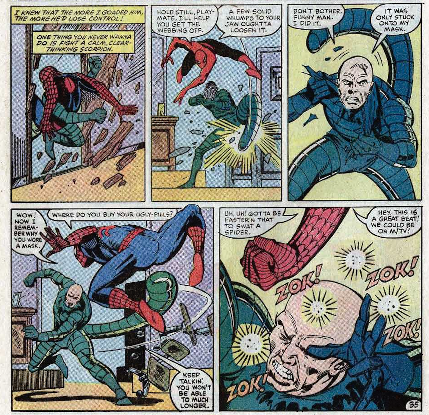 A chief appeal of drafting Lee to write Spider-Man again is that allows for him to tap another strength, writing comedic dialogue that is all the more appealing for its corniness. As if trying to prove he could still write for the kids, even as he had moved into his sixties, Lee also peppers the web-slinger’s lines with modern references. For example, a pummeling delivered to the Scorpion’s noggin is accompanied by a wisecrack that invokes the cable network then wowing all the teens.