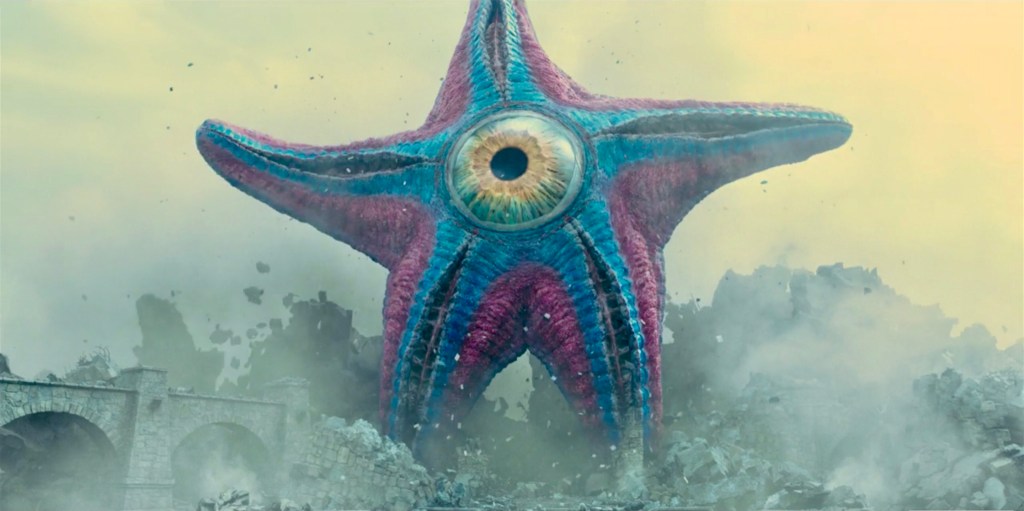 Gunn’s work with actors is more haphazard, and he’s occasionally done in by his tendency towards stunt casting. It’s enjoyable enough to watch Idris Elba leverage his easy charisma into the role of Bloodsport, the de facto leader of the latest assemblage of rough-around-the-edges teammates, and his one scene of escalating decibels with Viola Davis, returning as squad overseer Amanda Waller, has enough sparks that it invites rueful amusement that the two formidable actors are facing off in this spiked cotton candy rather than in a weightier project that would properly test them. Margot Robbie, taking her third sledgehammer swing as Harley Quinn, remains the scene-stealer, working flinty magic with flickers of expression and implausibly disarming line deliveries. Maybe more than any other reaction to the chaos, I found myself wishing The Suicide Squad were worthy of her. The movie probably tickles Gunn to no end and leaves him feeling satisfied that he was able to unfurl all his creative kinks. That self-satisfaction doesn’t automatically transfer to everyone one else gazing at the spectacle.