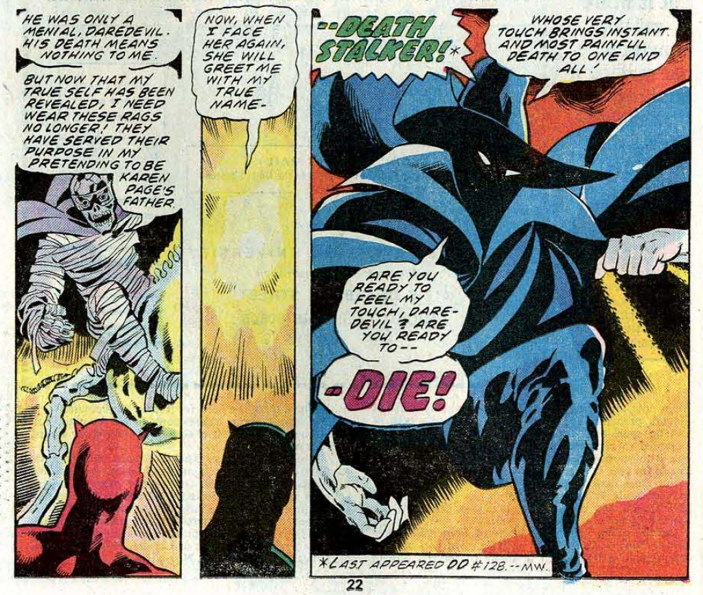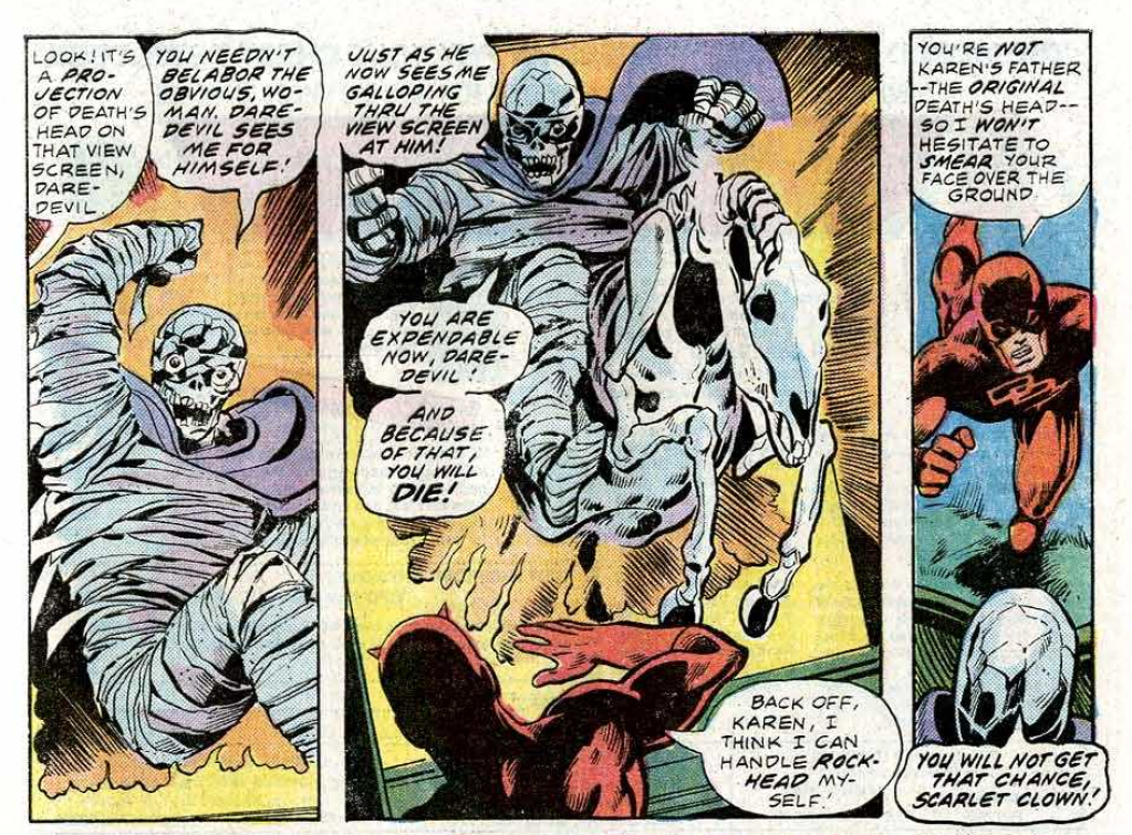 When last we left out heroes, all hell was breaking loose. A startled eyewitness in the mighty Marvel Universe might understandably interpret that well-worn phrase literally in the case of the fearsome finish of Daredevil #138. A hero dressed in an outfit that evokes the devil is being strangled by a mummy-bandaged fiend with skull for a head and a skeletal horse as transport while another fella with the bone of his cranium fully exposed and flames licking off him is crashing through a nearby window on his chopper. This is not a mundane afternoon.