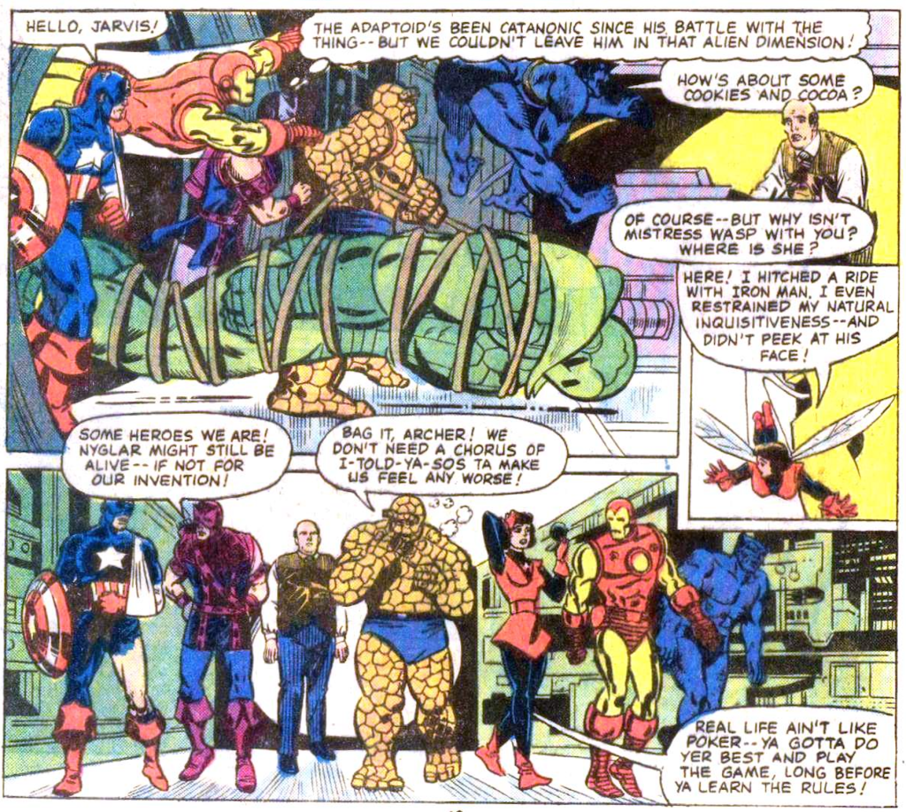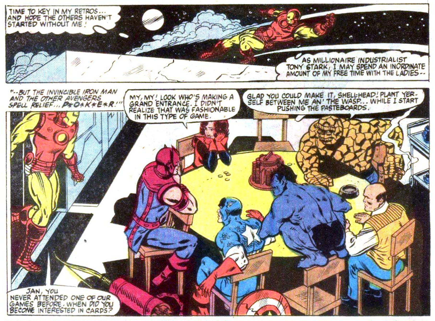 There are truly few happenstances in Marvel stories published in my youth that I enjoy more than when the good guys hangout socially in full uniform. Tony Stark is planning to spend an evening playing cards while adorned in head-to-toe armor. Maintaining a secret identity is an unending burden.