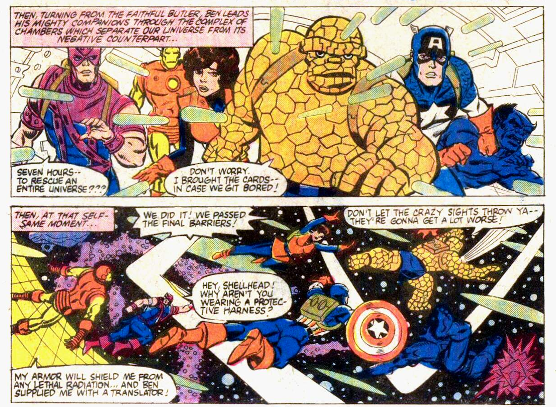 I was already fond of the series that regular teamed Benjamin J. Grimm, otherwise known as the ever-lovin’ blue-eyed Thing, with other costumed champions in the Marvel Universe. It was exciting enough that he was going to be cast into an adventure of such epic proportions that he would require assistance from the whole roster of the Avengers. That the cover promised the mighty melee would take place in the Negative Zone with no less than three monstrous super-villains made the mag a must-have. As a happy bonus, the heroes initially convene for one of my favorite reasons: so they can all play poker together.