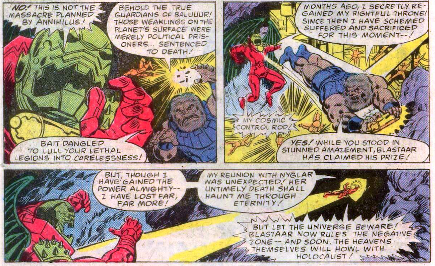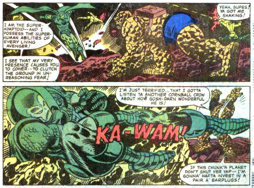And comics are also supposed to have lots of mayhem and furious fisticuffs. That’s helped along by Annihilus getting his gauntleted hands on the Super-Adaptoid, a big, clanking android with a talent for mimicking the abilities of every hero he’s scrapped with, a phalanx of former foes that comprised most of the Avengers by that point. Clearly, he was just the powerful pugilist needed to edge the inner clock of Aunt Petunia’s favorite nephew ever closer to a certain time.