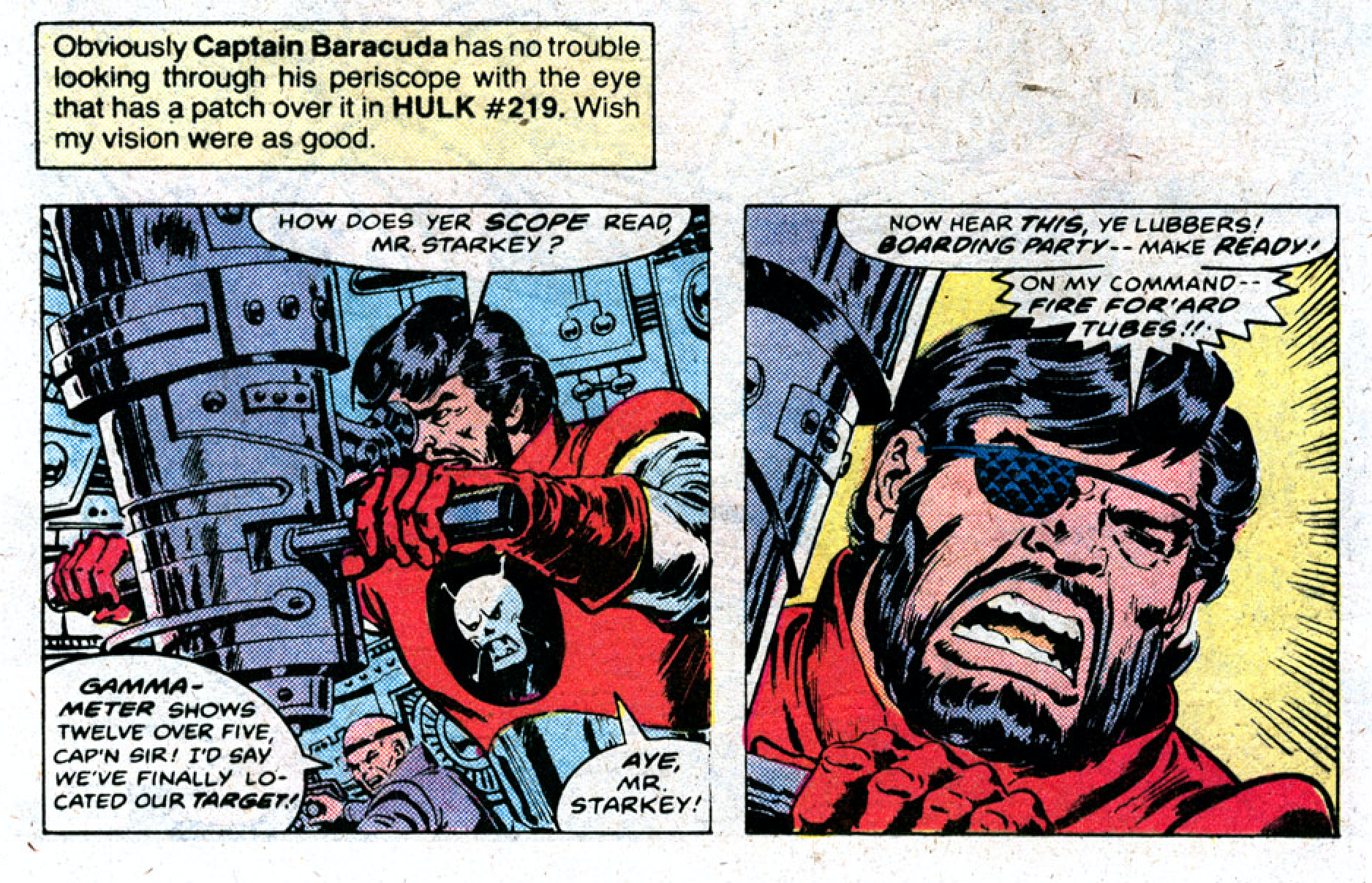 The narrative infractions hit every conceivable sour note. There are artwork abominations and goofs of basic fact, like the secret identities of different characters. There are times when the dialogue, usually owing to a distracted attempt to imbue fiery passion, becomes a jumble of incoherent bravado (Captain America promises a foe, “ONLY ONE OF US IS GOING TO WALK OUT OF HERE — UNDER HIS OWN STEAM — AND IT WON’T BE ME!“). Every stumble was a giggly gem, all making me wish I had been the one who first turned the page and hooted with excitement that I’d discovered something an editor should have corrected before the printed presses did their clanging business.