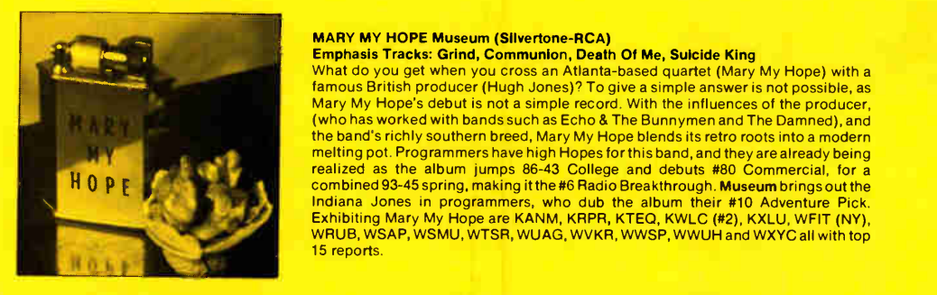 This is one of two records on our chart that nabbed us a mention on the Priority Emphasis pages of CMJ, a largely meaningless, basically random achievement that I was mortifyingly invested in.