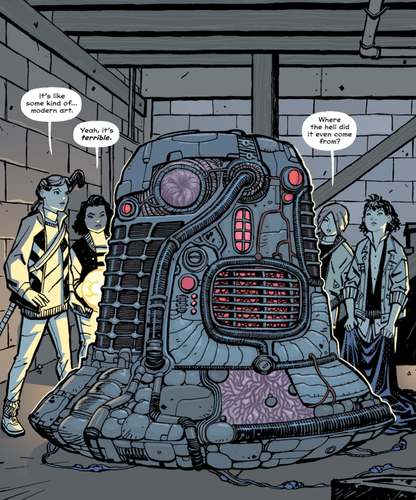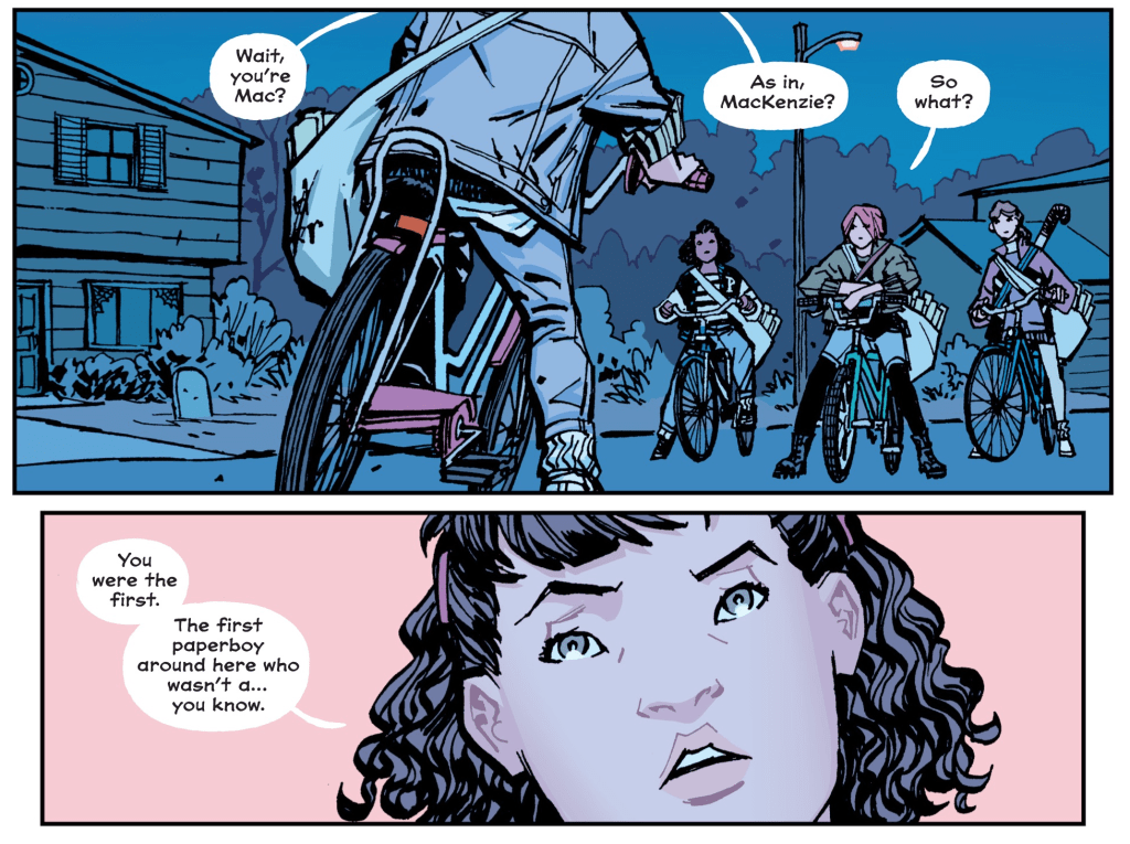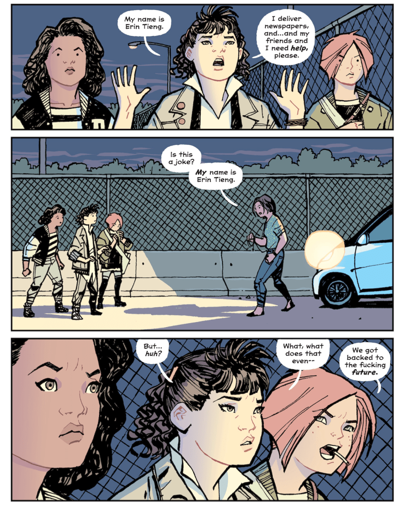 Written by Brian K. Vaughan and drawn by Cliff Chiang, the Image Comics series follows a quartet of tween girls who make their spending money by lopping the morning edition of the Cleveland Preserver onto front stoops all over their suburban community. Vaughan knows the value of having a character who’s an outsider when it comes to laying out exposition. To that end, he introduces Erin Tieng, a new girl in town who encounters three other atypical cohorts on the delivery beat. Because the rest of the cast needs to introduce themselves to Erin, they introduce themselves to the reader, too.