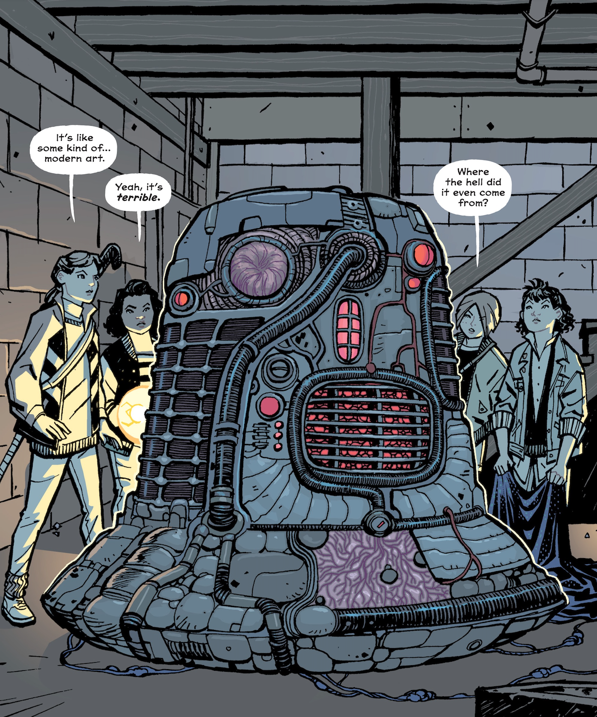Paper Girls plays with time travel, tears in reality, warring tribes, giant battling robots, and so much more. It also stays firmly grounded in the basic reality of teen girl life, such as the joy and challenges of friendship and even the experience of a first period. The comic is filled with clever humor, luminous poignancy, and striking narrative twists, all of entwined with the type of cunning insights that are the shining attribute of all the best speculative fiction. In every respect, Paper Girls is a delight.