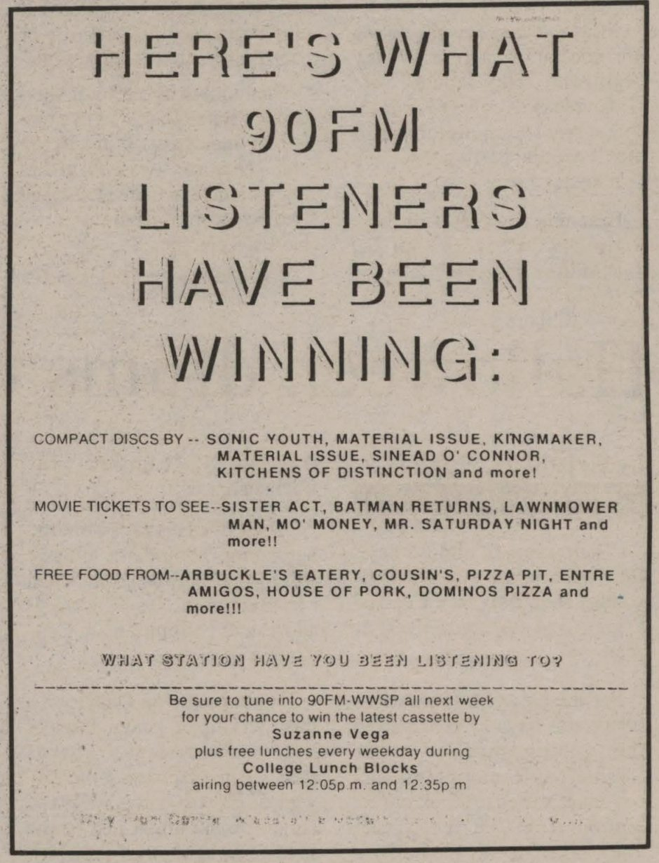 As I remember it, we were getting bored with the same old on-air giveaways somewhere around the spring of 1992. Like a lot of college radio stations, we at WWSP-90FM usually relied upon whatever stray duplicates of new music releases made their way to our mailbox for purposes of setting our array of prizes. Sometimes those extra copies were sent because we asked what could be spared to pass along to lucky-caller listeners and sometimes it seemed we were simply inadvertently serviced twice on the same album. All that was fine, and many of the listeners got some prime music to add to their collections, but we wanted a more robust, strategic approach to the contests we emanated on the airwaves. I guess we wanted to sound like a bigtime radio station.