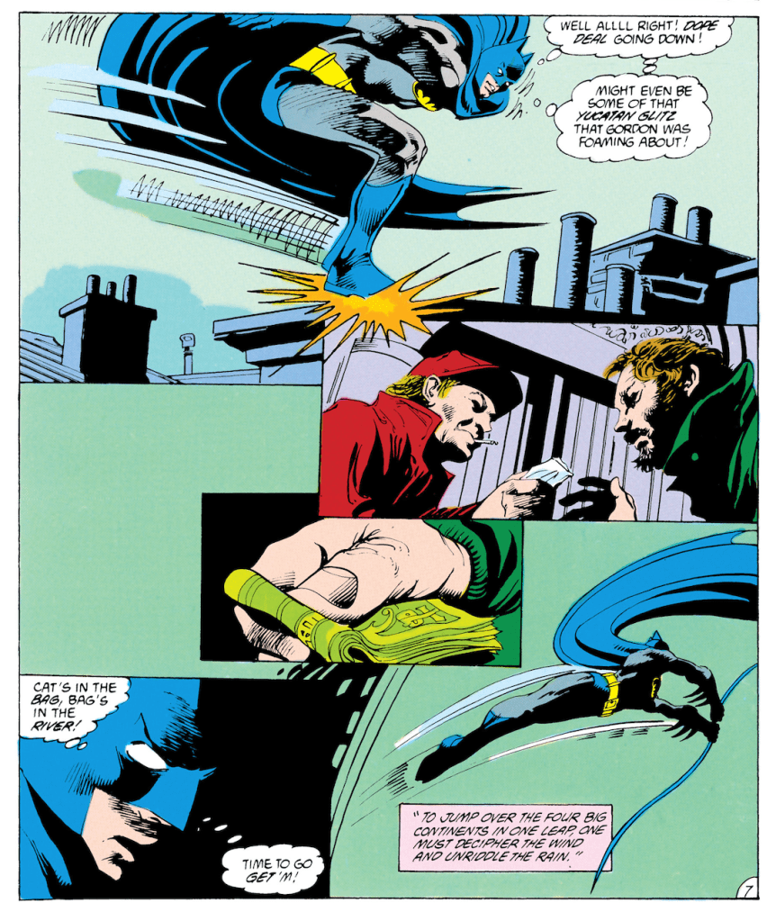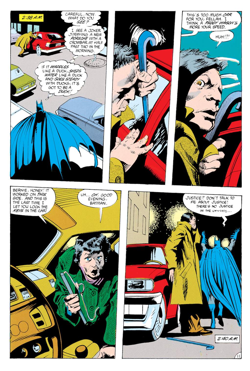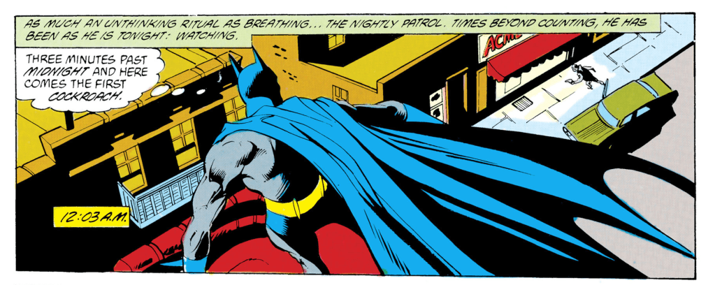 Ellison’s twist — his gag, really — is that Batman’s compulsive need to throw some punches and maybe a batarang or two is constantly thwarted. Maybe his role as rescuer is usurped because a old woman accosted by muggers can defend herself. Or maybe he’s entirely misinterpreted something as a crime, such as the bedraggled fellow jimmying his way into a vehicle not because he’s a car thief but in response to the common mistake of looking his own keys inside of it.