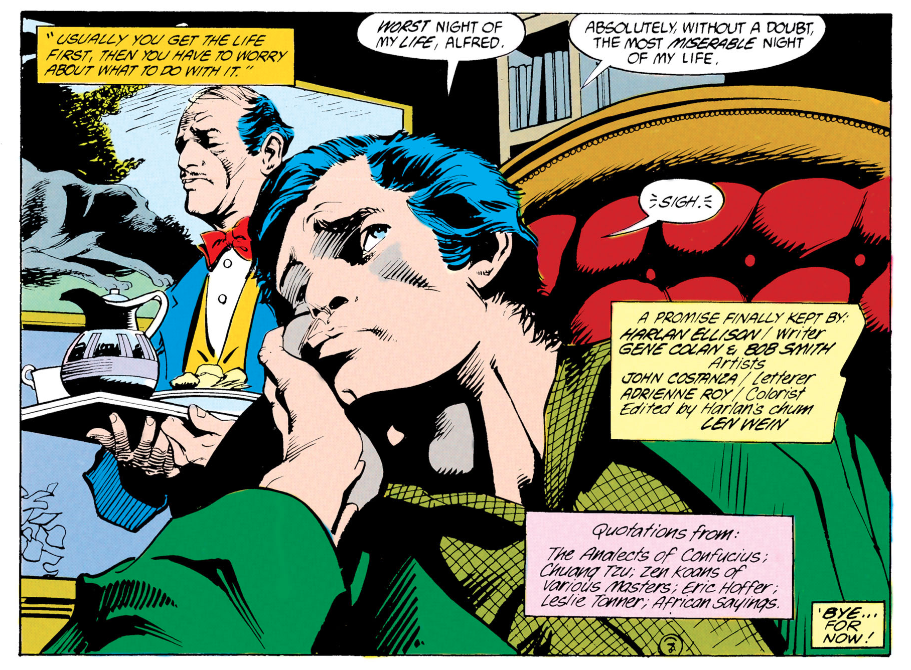 Ellison’s spin with Batman bears the very Ellison title “The Night of Thanks, But No Thanks!” Boasting pencils by the great Gene Colan, the story tracks through one night in Gotham City as Batman makes the rounds, looking for miscreants and evildoers, determined to mete out justice. All the while, quotations from the likes of Confucius and philosopher Eric Hoffer burble up in the captions.