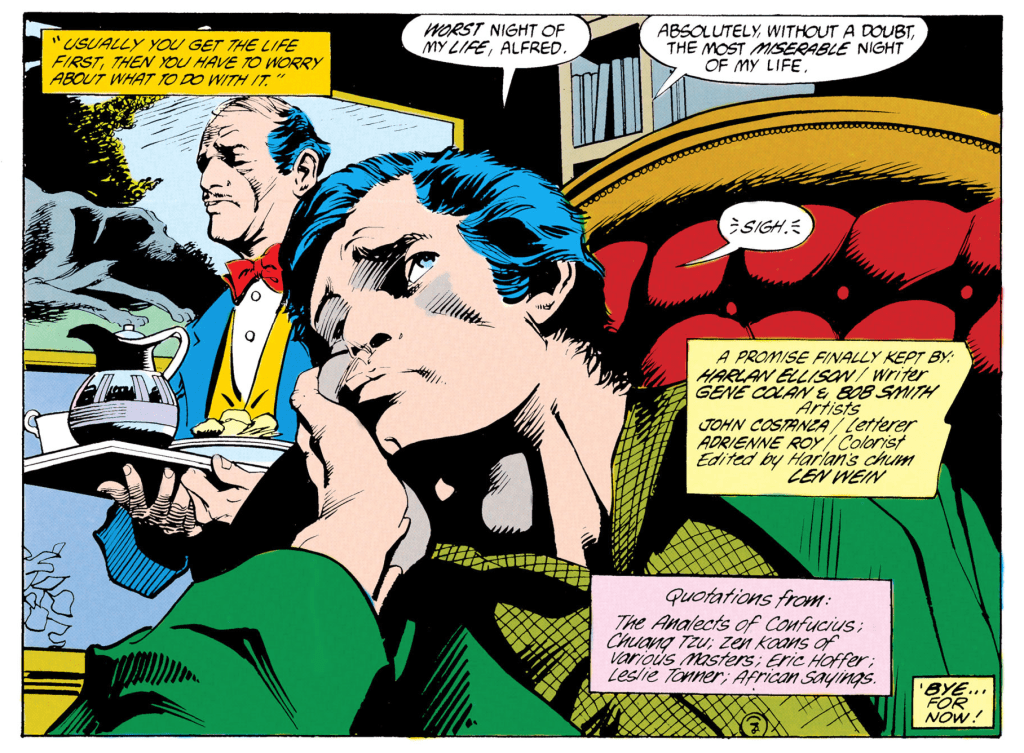 It’s just a little wisp of comic. If not for the titan of letters who signed his name to it, this issue of Detective Comics would be easy to forget. There’s certainly no indication that fifteen years of anguished invention and painstaking finesse went into it. But it’s also joyfully tickled with the tropes and dynamics of superhero comics in a way rarely achieved in the decades of grim-and-gritty depictions of Batman that soon followed. Informally, this was the last issue of Detective Comics before the reinvented version of the DC Universe that launched out of the monumental Crisis on Infinite Earths limited series. Ellison might not have had a real deadline, but it does feel like his Batman story was delivered at the last possible moment that it was viable.