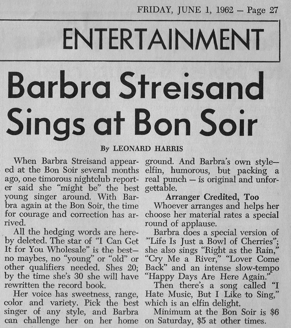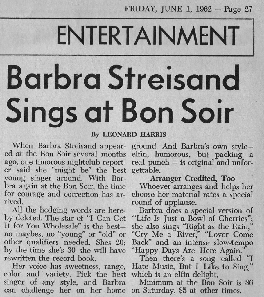Prompted by the release of a new album of live recordings from an early-career set at the New York club the Bon Soir, Wesley Morris writes about Barbra Streisand as an emerging artist in the early nineteen-sixties. A partial review of the new release, the artist is mostly a compelling conjuring of what it must have been like to come across a once-in-a-lifetime talent in a small, smoky club at a time when the entertainment world was still comprised of small little pockets all brimming with possibility. This article is published by The New York Times.