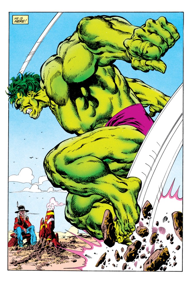 Set in the southwestern desert territories that the Hulk was known to thumpily bound around, the issue starts with Hulk encountering a man who appears to be a Native America shaman. Just when Hulk is about to commence with some characteristic smashing, the wizened gentlemen wins over the towering titan with a simply stated offer of friendship. Also, the shaman gets the Hulk good and stoned.