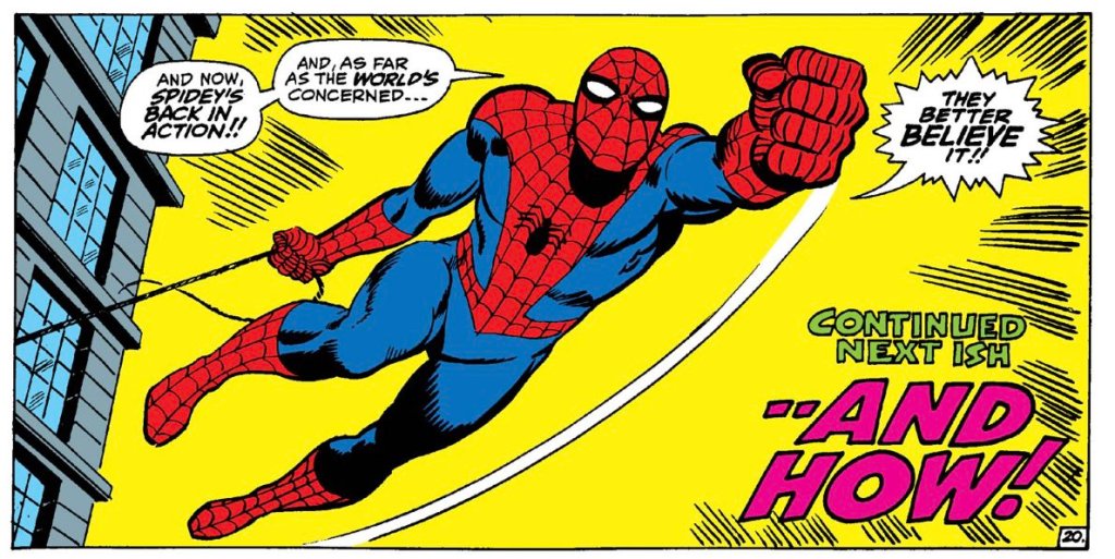 Romita was served well by those countless stories of swooning and lovelorn guys and gals that were previously his speciality. He took on the vast and varied supporting cast around Spider-Man — more importantly, around the ol’ web-head’s alter ego, Peter Parker — with tremendous precision of visual characterization. Between the thwips of our hero’s web-shooter, the stories were a vividly alive soap opera, including the most engaging love triangle to ever grace a newsstand. Romita was a deft draftsman of action, too. Even so, when I read his whole run on the title a few years back, I was struck by how often the two-fisted scraps between heroes and villains came across a diversion from watching the interpersonal relationships evolve rather than, as with so many other titles, the other way around. It’s telling that Romita’s most iconic images from those comics aren’t slam-bang tussles. Rather, they are smaller feats of storytelling: a discarded costume, the quiet closing of a door, and, most notable of all, a jackpot hit.