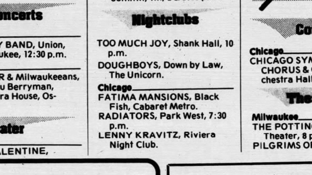 When a group of us college radio kids participate in the beater car caravan from our modest Midwestern college burg to the big city of Milwaukee, it was the closest many of us would come to a religious pilgrimage. The ultimate destination was a small club on the eastern edge of the urban landscape. We were going to see Too Much Joy.