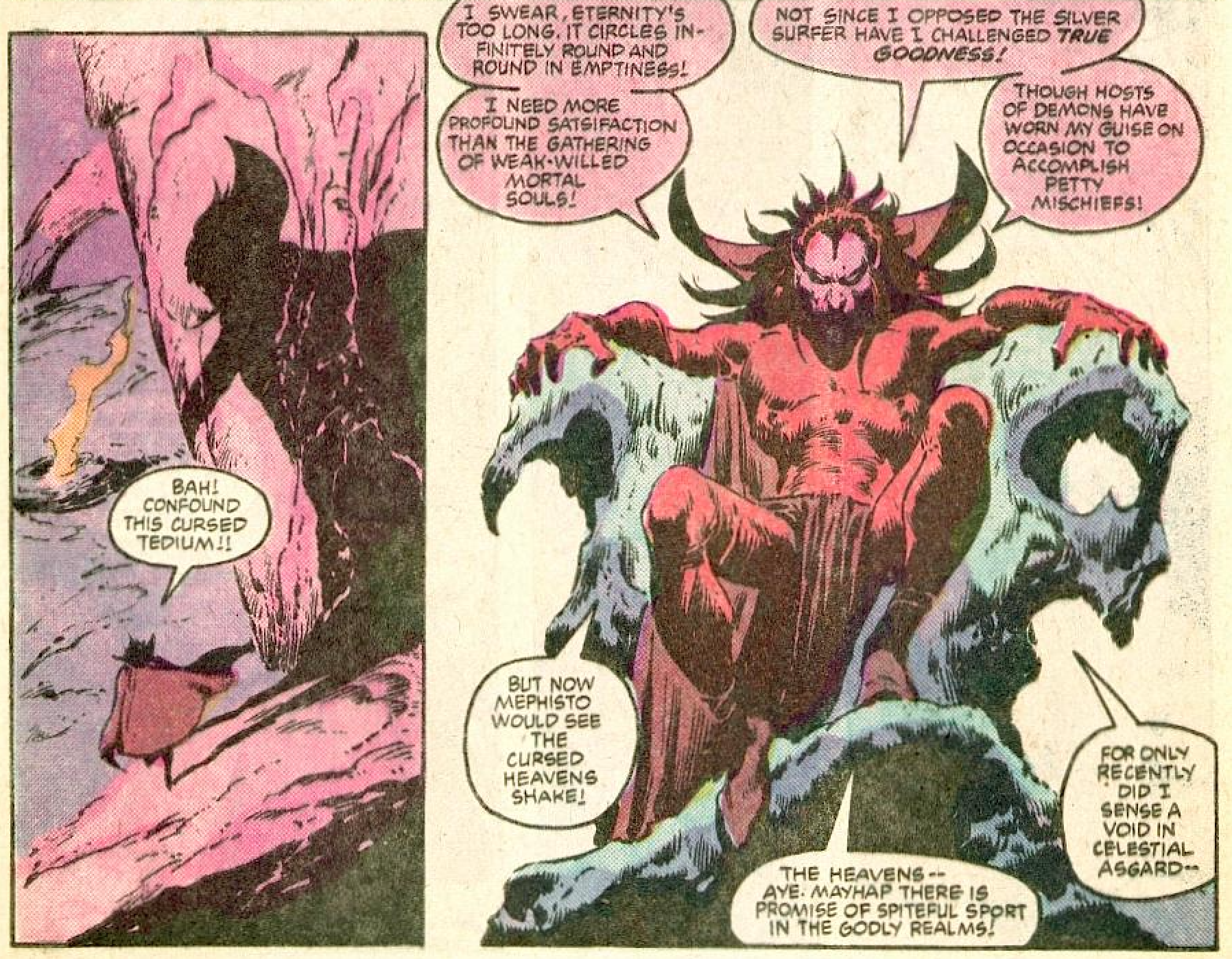 Introduced in the pages of the first Silver Surfer series, which Stan Lee wrote and Buscema drew, Mephisto was Marvel’s version of the Devil. Accordingly, he was supposed to be the baddest of the bad, but the demands of filling out an ambitious monthly schedule of titles sometimes meant Mephisto was dragged into more rinky-dink stories. As if reclaiming Mephisto, Zelenetz includes the aside that he hasn’t really done battle with any heroes other than Silver Surfer; all other appearances were far more feeble demons skulking round in phony Mephisto garb.