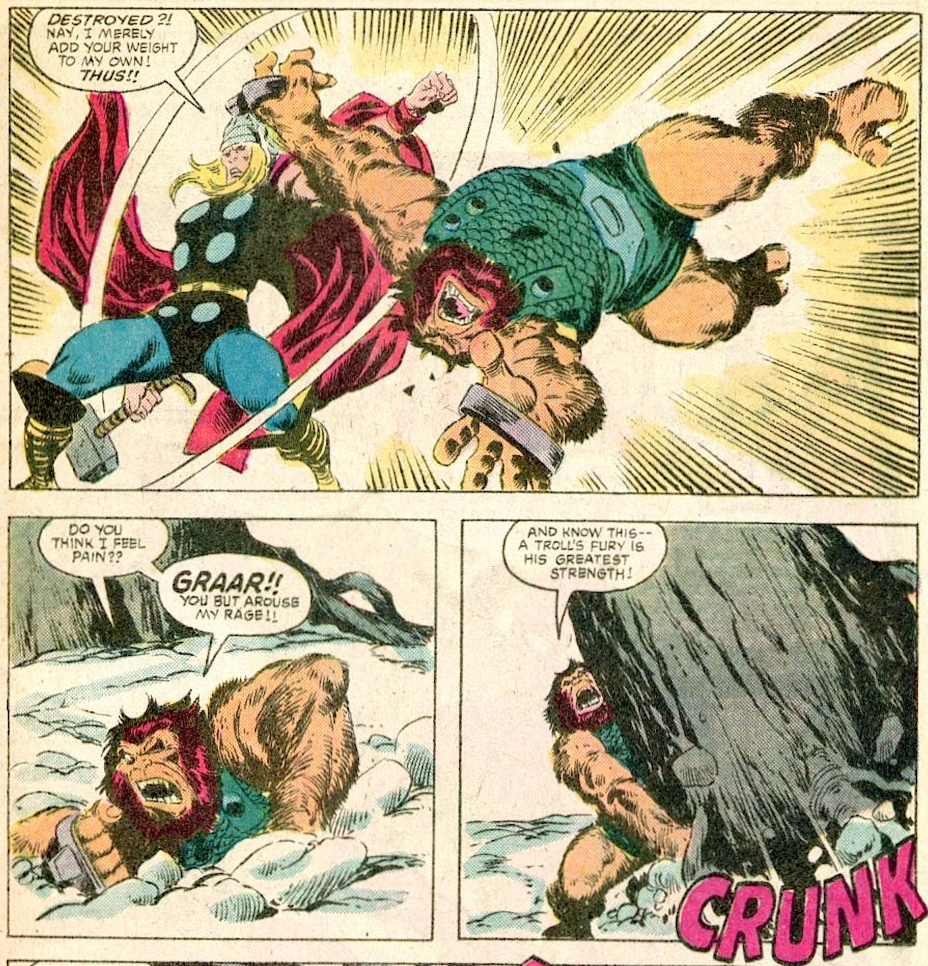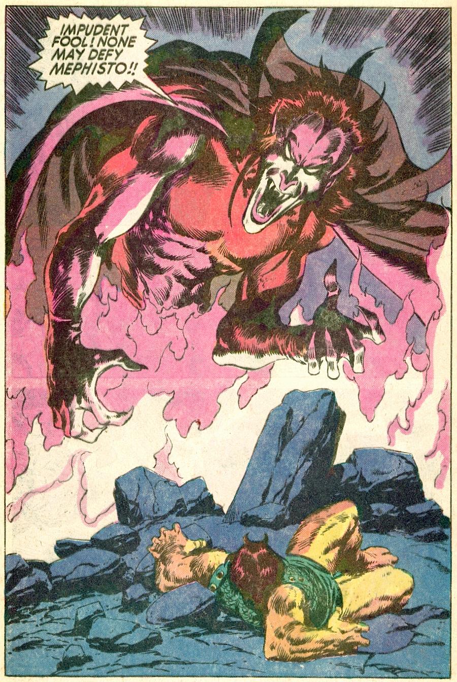 Feeling bored and unchallenged in his smoldering underworld, Mephisto decides it would be a nice diversion to go toe to toe with Thor, figuring only a Norse God will be a formidable enough foe. Mephisto sees that Thor is a sulky mood, brought on by the recent death of his father, Odin. Mephisto wants the thunder god worn down a bit before he lures him into a direct fight, so he forcibly enlists Ulik, a mighty rock troll, to step in for the undercard bout.