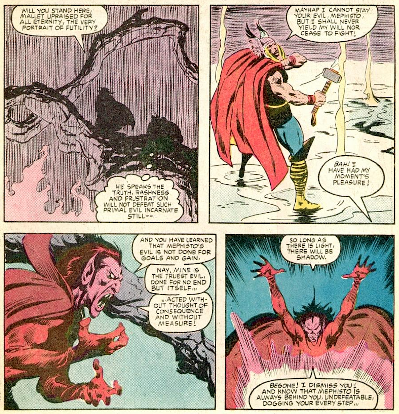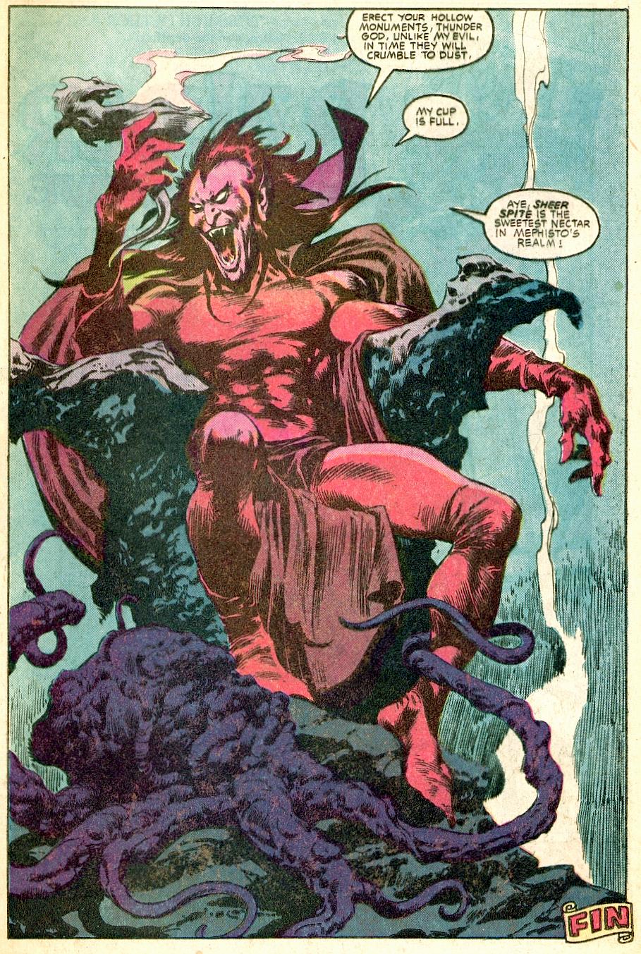 Even when Thor is sullen and depleted, Ulik is no match for him. Before long, Thor has moved on to the master manipulator behind the whole affair. The scope of the story grows vast as Thor confronts another godlike figure in his mythic realm. When titans at this level clash, the outcome is all but assured. Thor calls down torrential rains in Hell, Mephisto wields his evil magic, and it all ends in a stalemate.