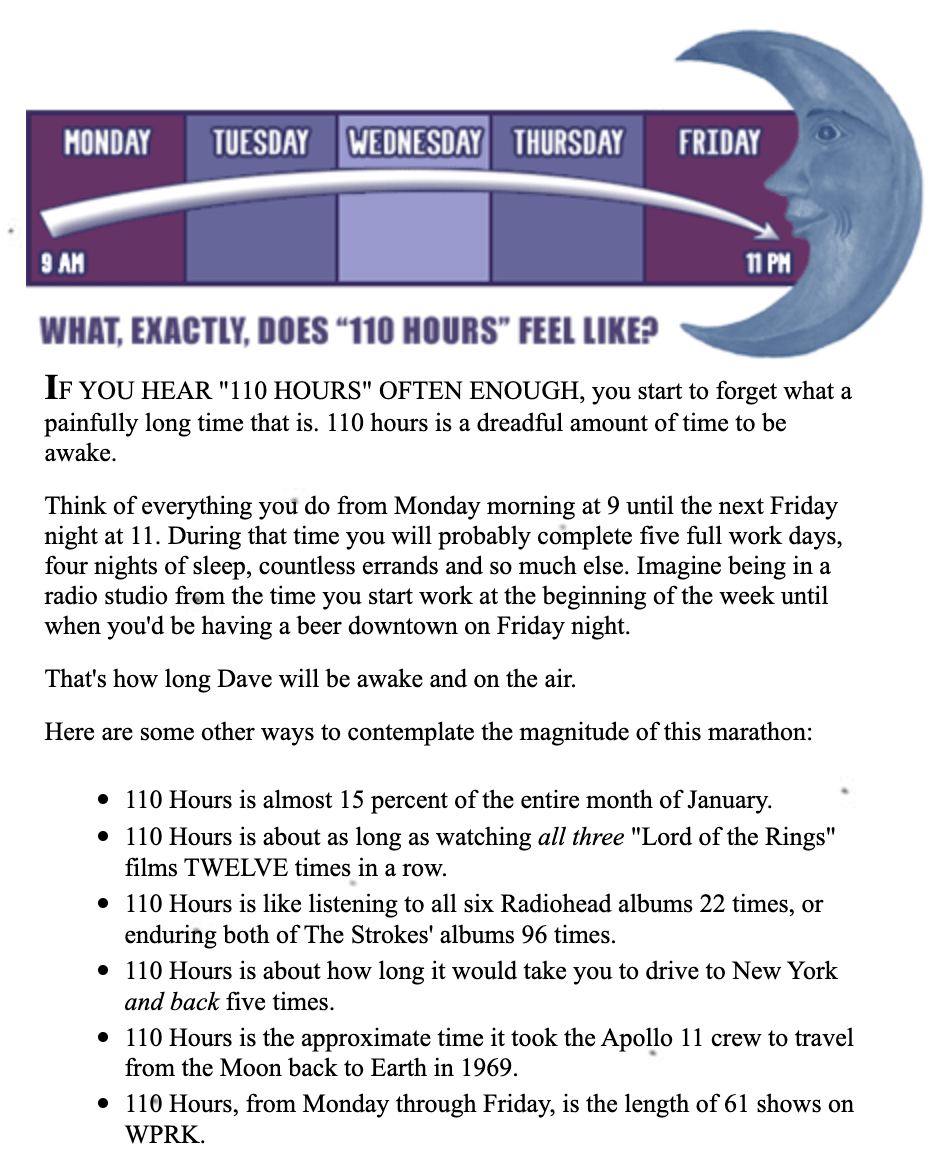 Dave Plotkin came to me with an idea. The idea was fascinating, exciting, and outlandish. Basically, it was the sort of idea that no one else could have come up with and yet felt natural as could be zephyring out of his perpetually engaged brain. Dave wanted to break the Guinness World Record for a solo continuous radio broadcast, and he wanted the effort to be a fundraiser for WPRK-FM, the student-run radio station where he volunteered and I served as the general manager and advisor. At the time, the record was 105 hours, so basically four and half days straight. Dave was determined to get to 110 hours.