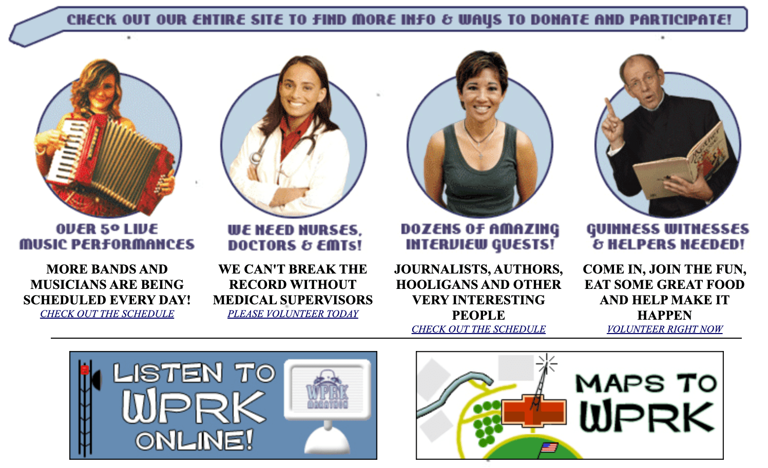 This proposal happened in 2004. As I was more or less obligated to do, I identified all the hurdles we needed to clear in order to make it happen. We talked about everything we required to ensure the college that held the station’s license would see the stunt as safe and would thusly provide the necessary support — or at least not try to shut it down midstream. We communicated with the Guinness folks about the strictures we needed to follow to satisfy them and worked through the logistics of recruiting the volunteer staff we would need to help meet those strictures. We discussed it with the student staff to gauge if they were prepared to do the heavy lifting required to make this mammoth undertaking a reality and to solicit their ideas about to how to make the programming as strong as it could be.