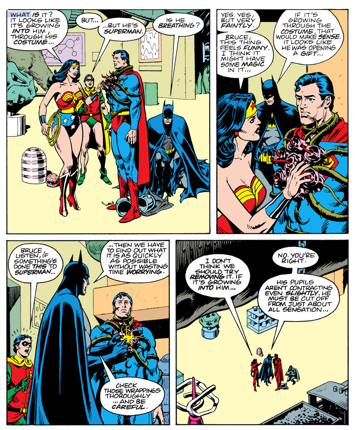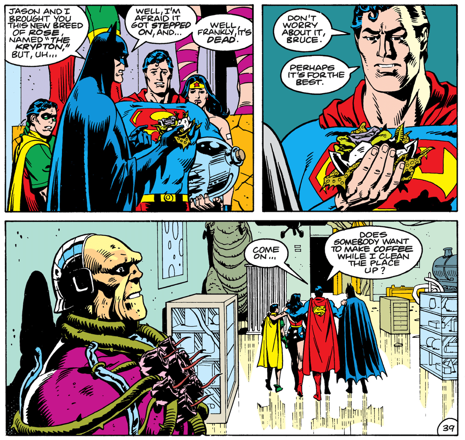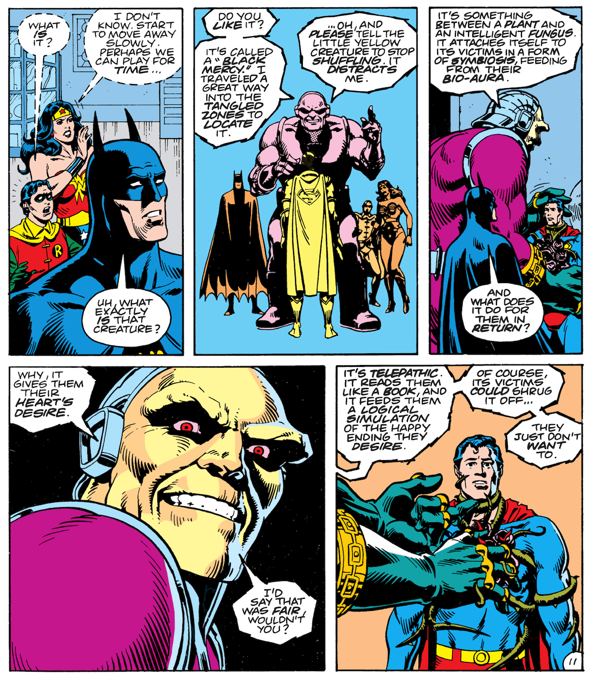 Back in the Fortress of Solitude, Superman’s visitors encounter Mongul, the hulking foe who foisted the fearsome flower on him. Mongul explains that the alien growth in question is a Black Mercy, which has plunged Superman into a delusion he’s unlikely to escape from.