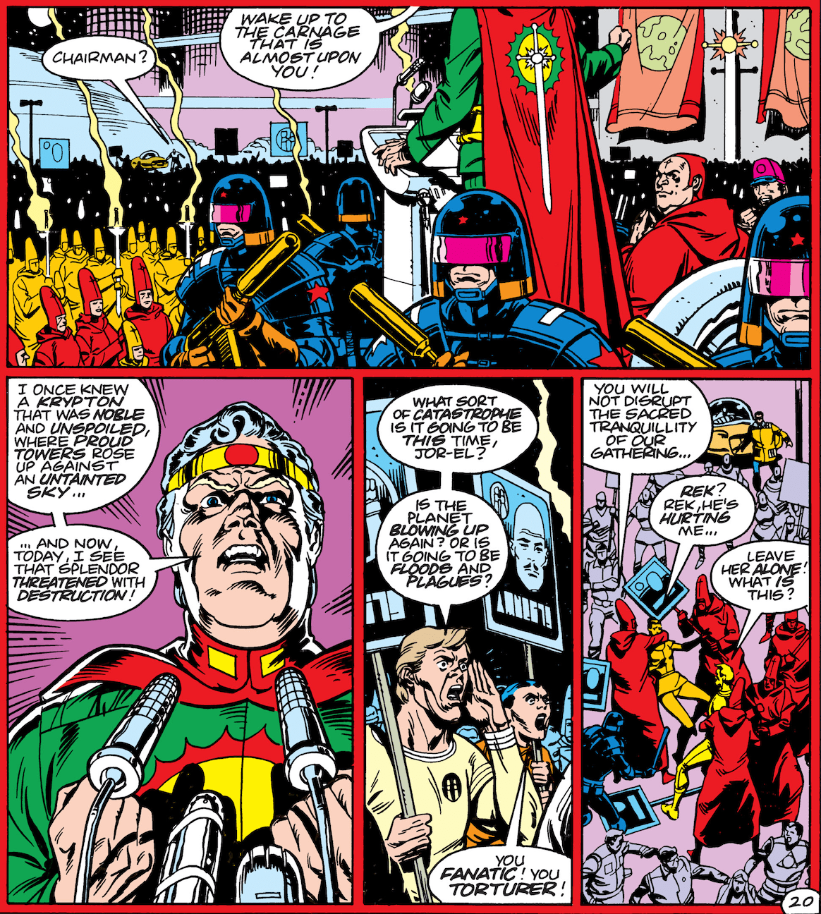 As Wonder Woman, Batman, and Robin do battle with Mongul, Superman’s vision of his homeworld grows more disturbing. Jor-El takes his bitterness and anger to the logical endpoint reached by all small men with access to the levers of power. He spits out false rhetoric of past greatness in their land and insists to his cultish disciples that he’s the only one who can restore that glory. When dissenting voices are raised, he dispatches anonymous militarized goons to terrorize them into submission.