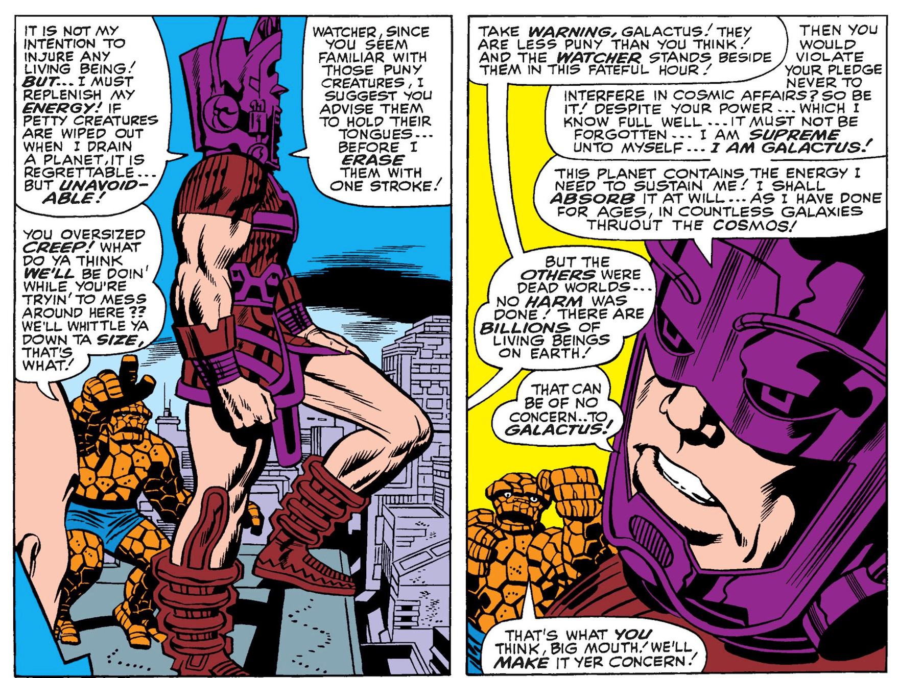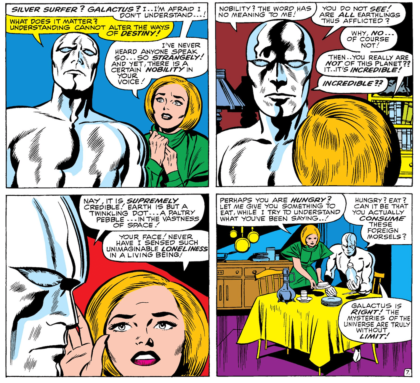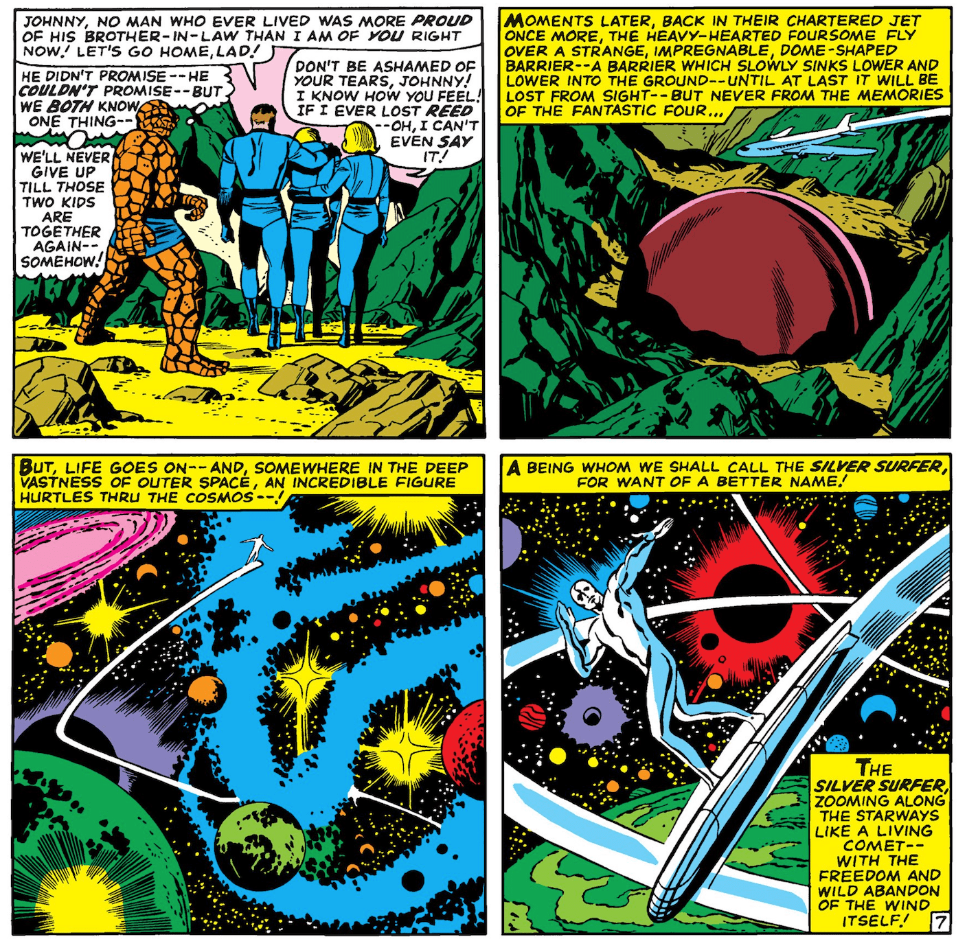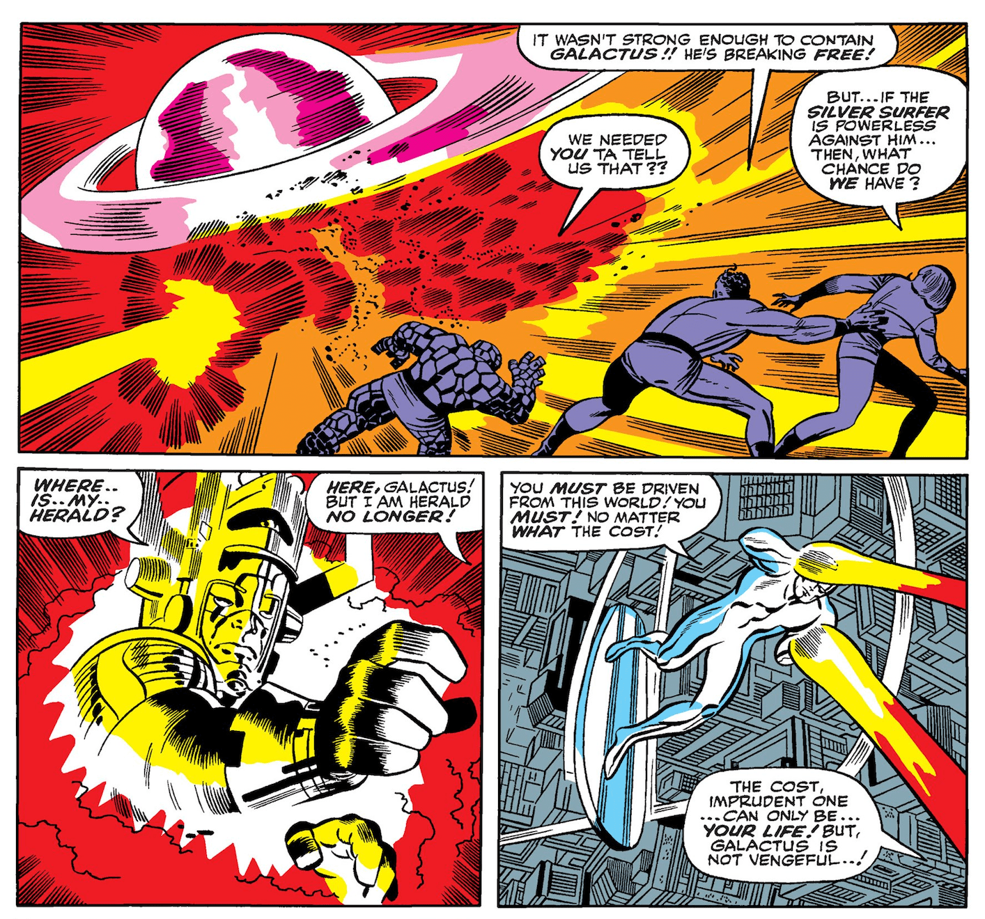 The Silver Surfer and the Fantastic Four succeed in preventing Galactus from eradicating Earth. When it seems the tale is resolved, Lee and Kirby have one last grand dramatic turn left. To punish the servant who turned against him, Galactus uses his nearly infinite abilities to confine the Silver Surfer to the planet he just saved.